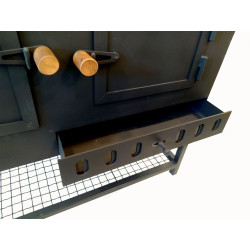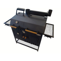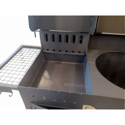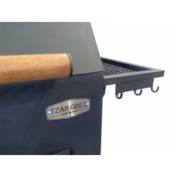 Гриль має бокові полиці оснащені гачками та полиця знизу для дров.