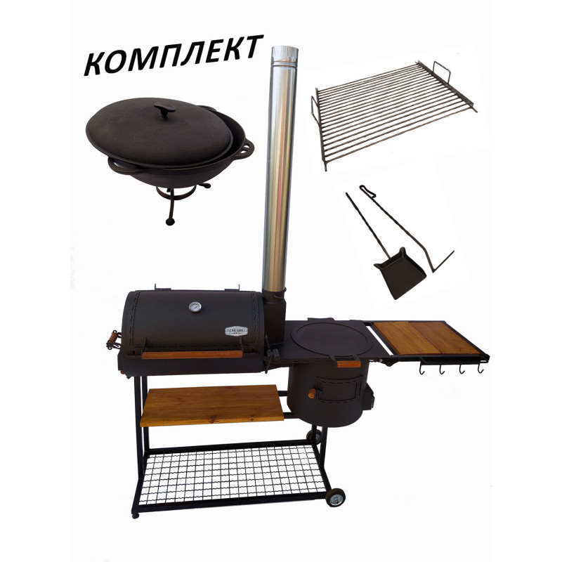Смокер, димохід 1 метр, бокова полиця, піч під казан, колеса, сітка 500х380мм, казан на 12л, кришка під казан, підставка під казан, совок та кочерга.